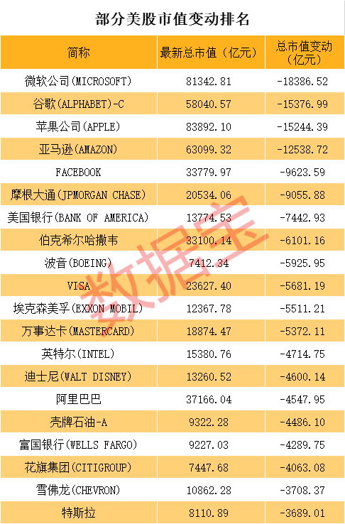美股市值相比2月19日蒸发56万亿元。4家公司市值蒸发超过万亿元,分别是微软公司、谷歌、苹果公司、亚马逊。FACEBOOK、摩根大通、美国银行等8家公司市值蒸发超5千亿元。