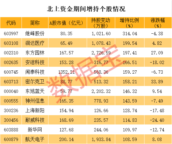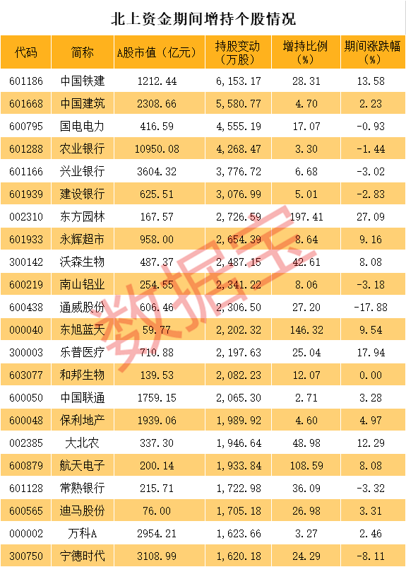 北上资金在市场震荡期间的动向值得关注。数据宝统计显示,其中,增持中国铁建6153万股居首,增持中国建筑5580万股位居第二,增持国电电力4555万股位居第三。增持比例方面,