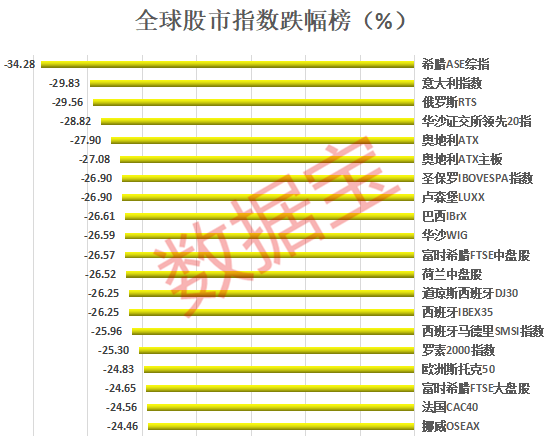 希腊ASE指数跌幅高达34.28%位居全球股市跌幅榜首位,紧随其后是意大利指数,下跌幅度为29.83%。