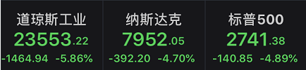 已经牛市11年的美股市场也正式跌入熊市。美东时间周三,美股三大股指再次大幅下跌。截至收盘,道指跌1464.94点,跌幅5.86%,报23553.22点,陷入技术性熊市。标普500指数跌140.85点,跌幅4.89%,报2741.38点。纳指跌392.2点,跌幅4.7%,报7952.05点。