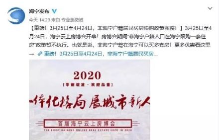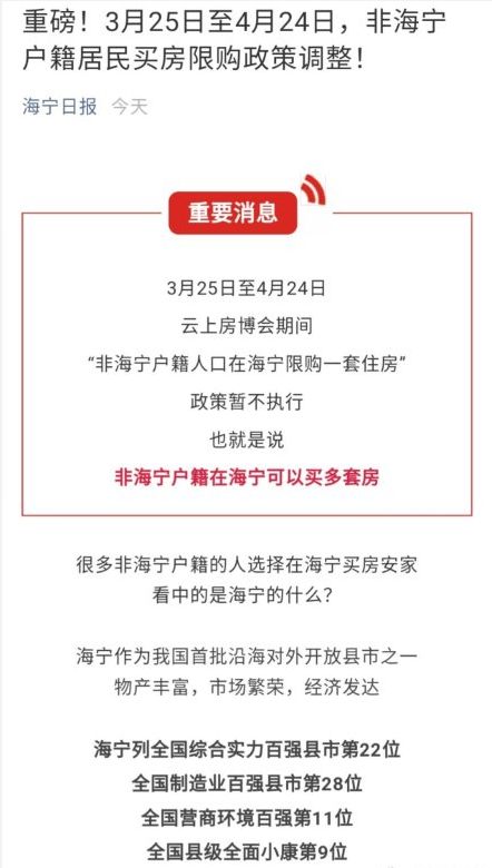 同时,海宁市委机关报《海宁日报》公众号也发布消息《重磅!3月25日至4月24日,非海宁户籍居民买房限购政策调整!》,即3月25日至4月24日“云上房博会”期间 “非海宁户籍人口在海宁限购一套住房”政策暂不执行。这意味着,非海宁户籍此前只能买一套住房,现在开始到未来1个月,可以在海宁买多套住房。